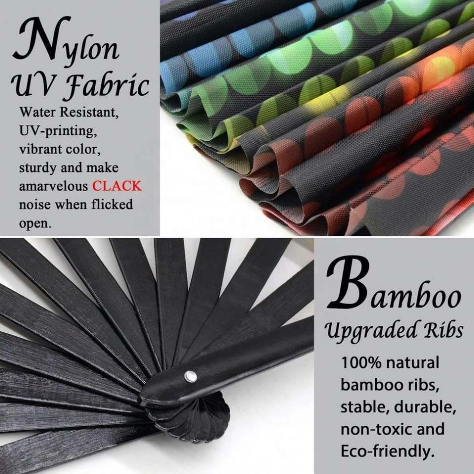 Éventail pliant en bambou imprimé UV réfléchissant de haute qualité pour fêtes, idéal pour les soirées déjantées et les raves