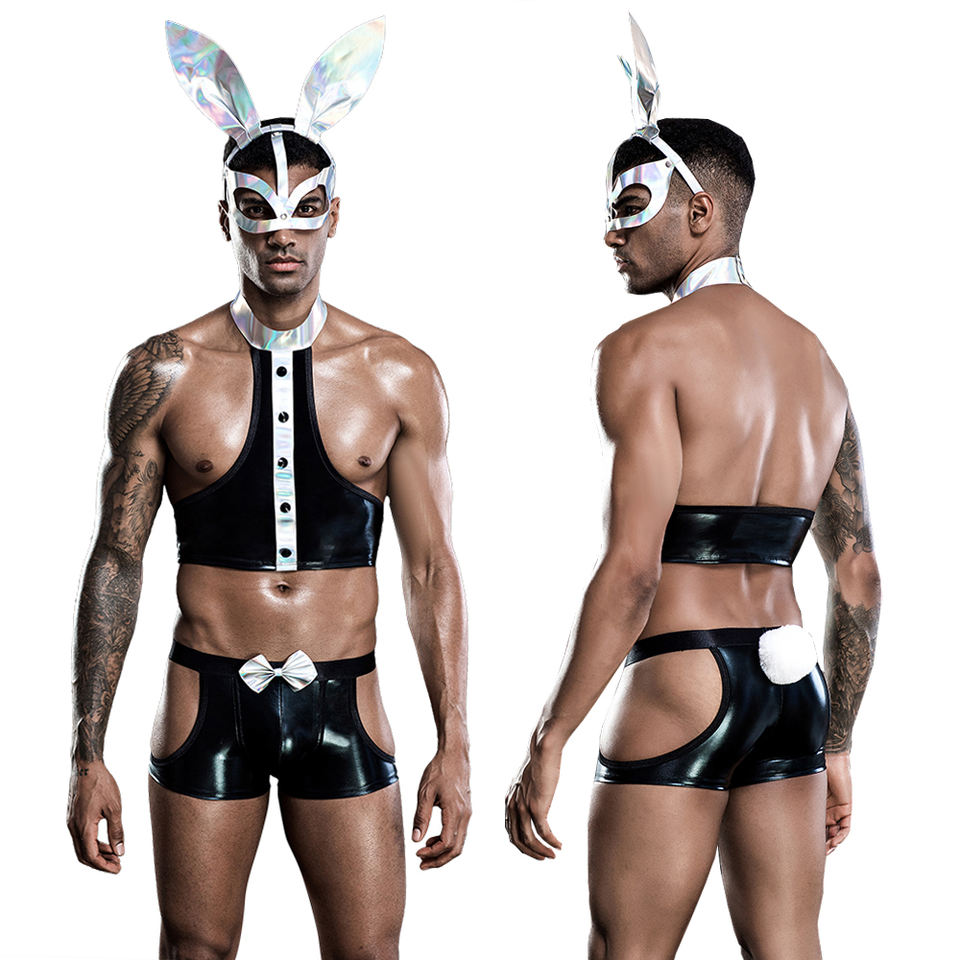 Lingerie érotique pour hommes adultes en cuir PU de haute qualité, costume de cosplay de lapin sexy pour hommes, costume de carnaval avec masque