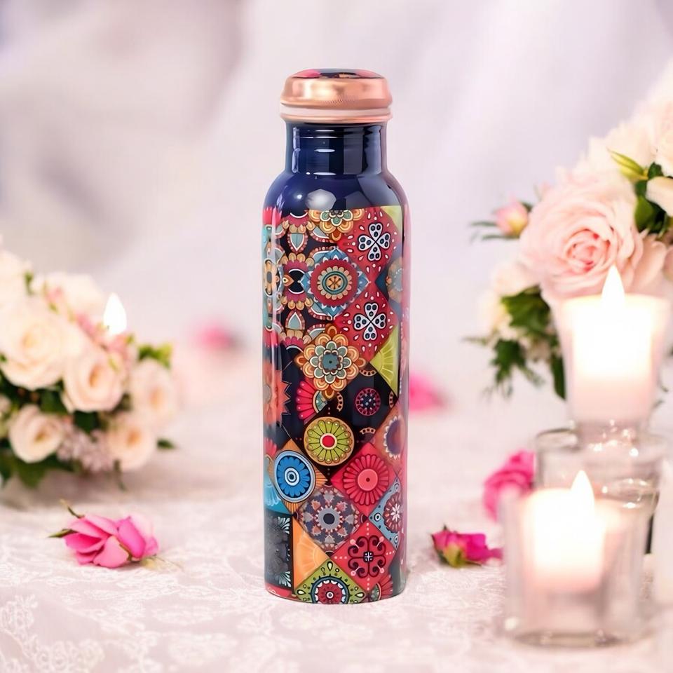 Bouteille d'eau imprimée en cuivre pur de haute qualité disponible dans des impressions gratuites personnalisées avec des bouteilles d'emballage de qualité supérieure réutilisables
