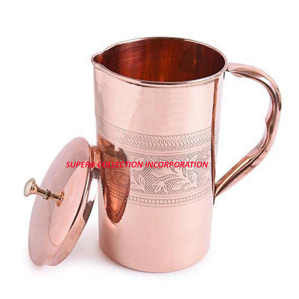 Pichet à eau en cuivre pur de haute qualité conception de gravure à la main vente directe d'usine artisanat indien dessus en métal poli