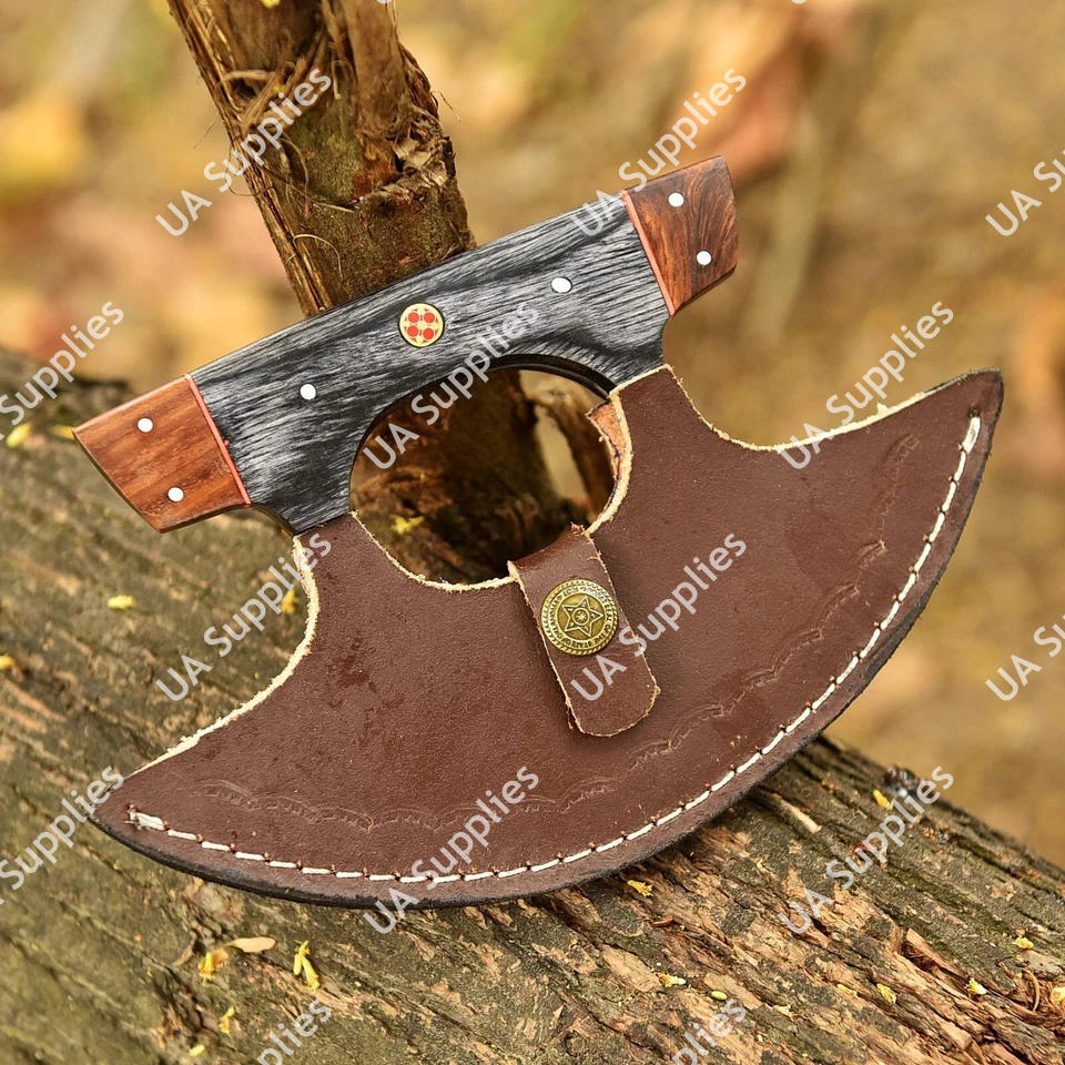 Couteau Ulu de haute qualité, lame en forme de croissant à motif Damas, manche en bois véritable, étui en cuir, couteau de cuisine pour hacher