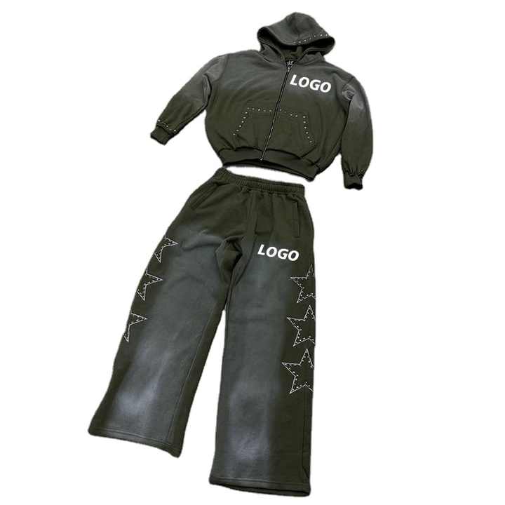 Survêtements de haute qualité avec strass et broderie, ensemble de survêtements avec fermeture éclair et effet soleil, impression baggy 100% coton, logo personnalisé pour hommes