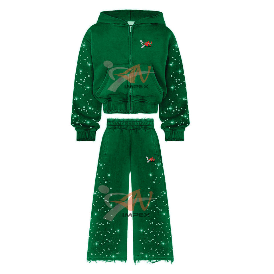 Ensemble de survêtement unisexe en deux pièces avec pantalon de survêtement à pattes évasées et sweat à capuche zippé, orné de strass de haute qualité, effet délavé à l'acide, style vintage