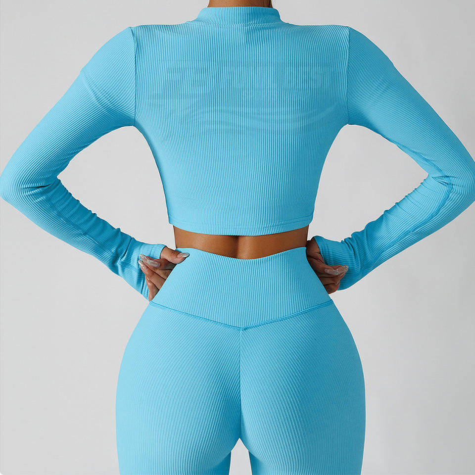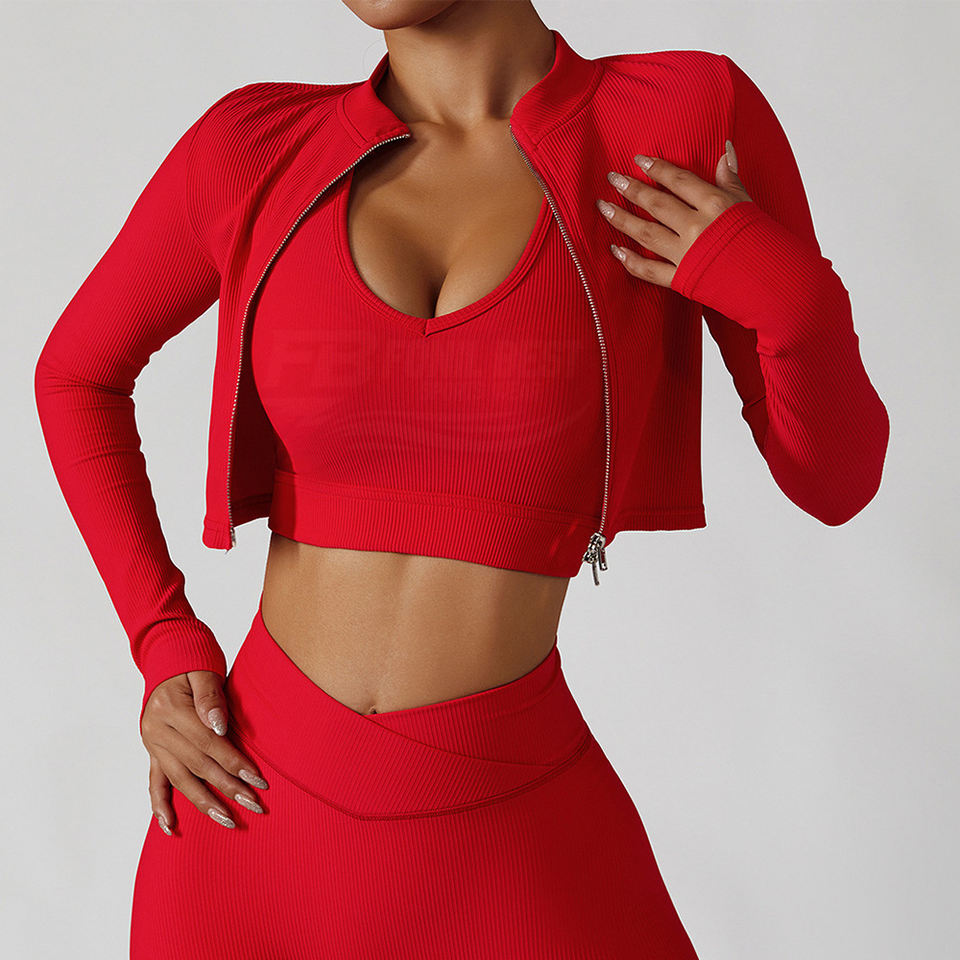 Ensemble 3 pièces de sport côtelé de haute qualité pour femme : Soutien-gorge push-up, crop top et pantalon de yoga à taille élastique en V avec double fermeture éclair