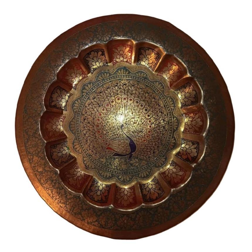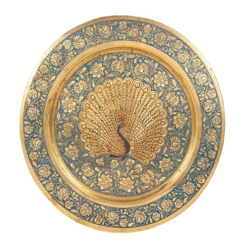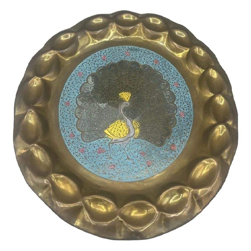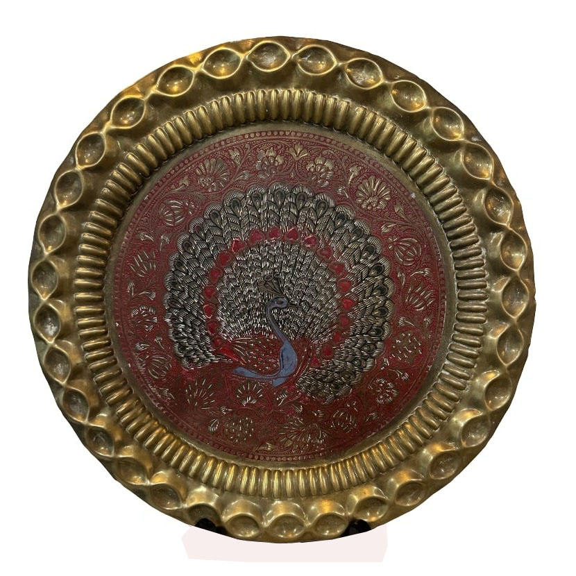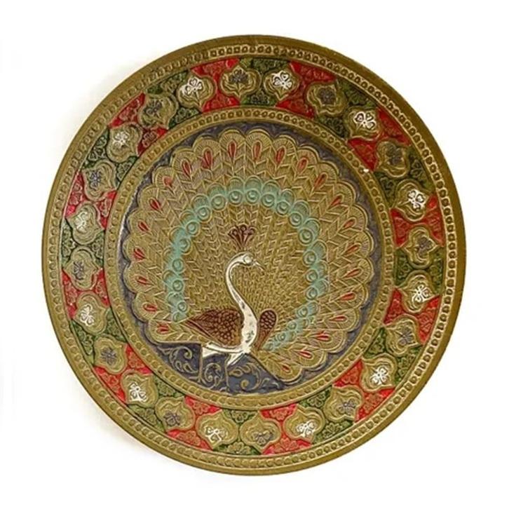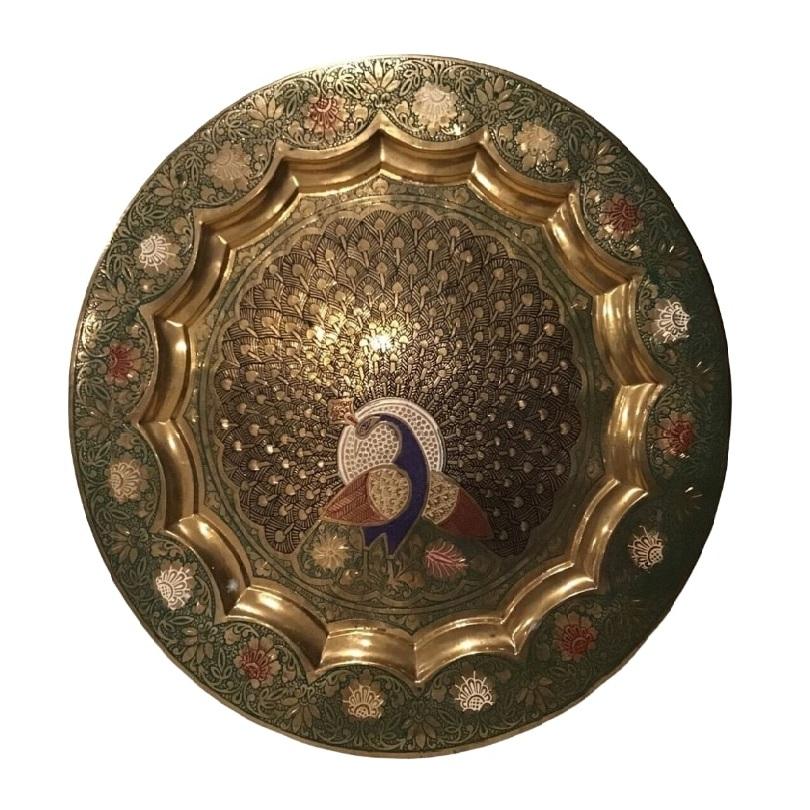 Assiettes de service rondes de haute qualité en laiton pur avec un motif de paon gravé, multicolores et finition polie pour une utilisation en cuisine