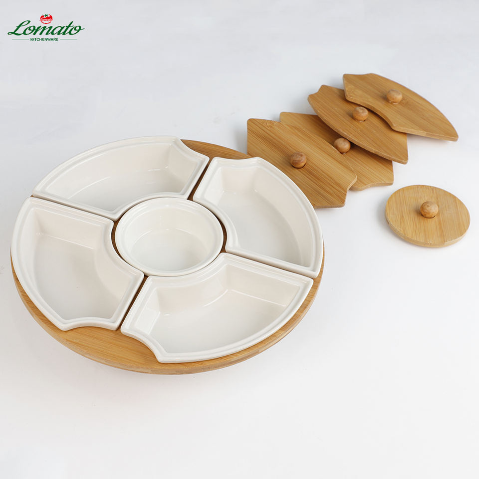 Fromage rond en bois de bambou de haute qualité Snack Petit déjeuner Salade Dessert Plateau de fruits avec assiette en céramique amovible Bol plats