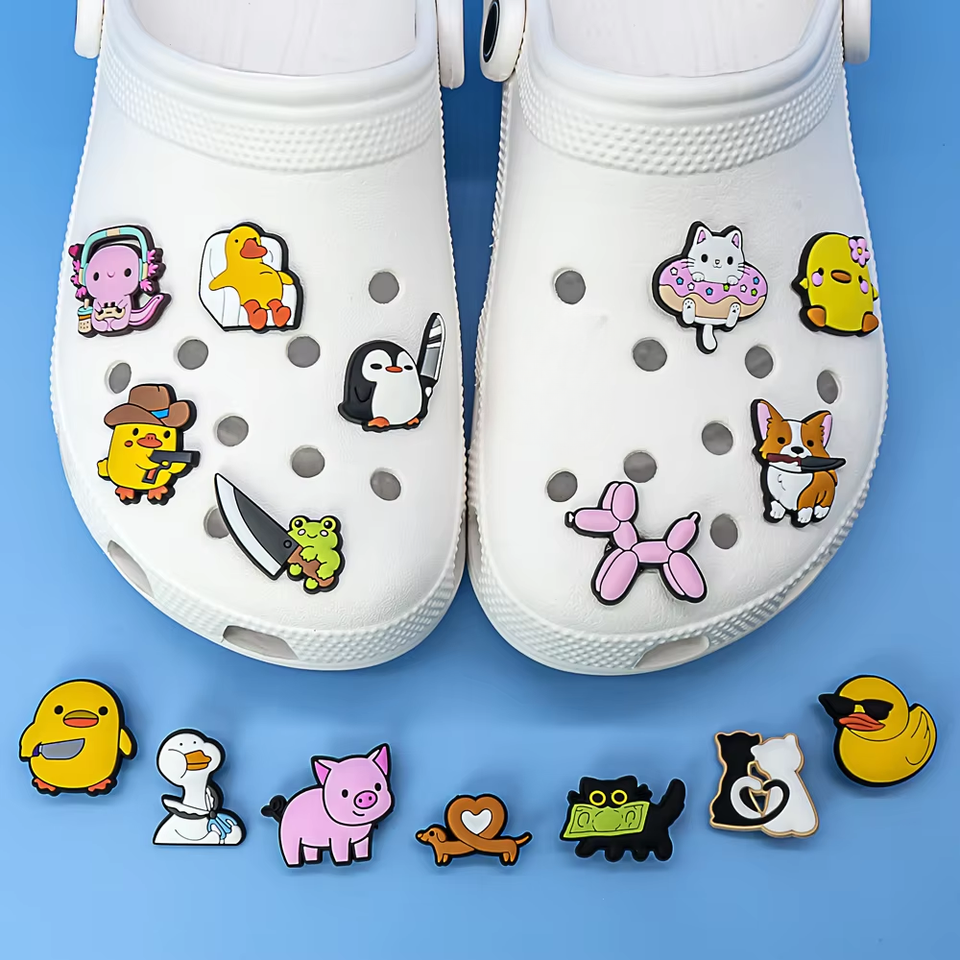 Breloques de chaussures en caoutchouc PVC de haute qualité, motifs canard jaune, chien, chat, salamandre, pour sabots, décorations 2D/3D, vente en gros, breloques animales de dessin animé en vrac