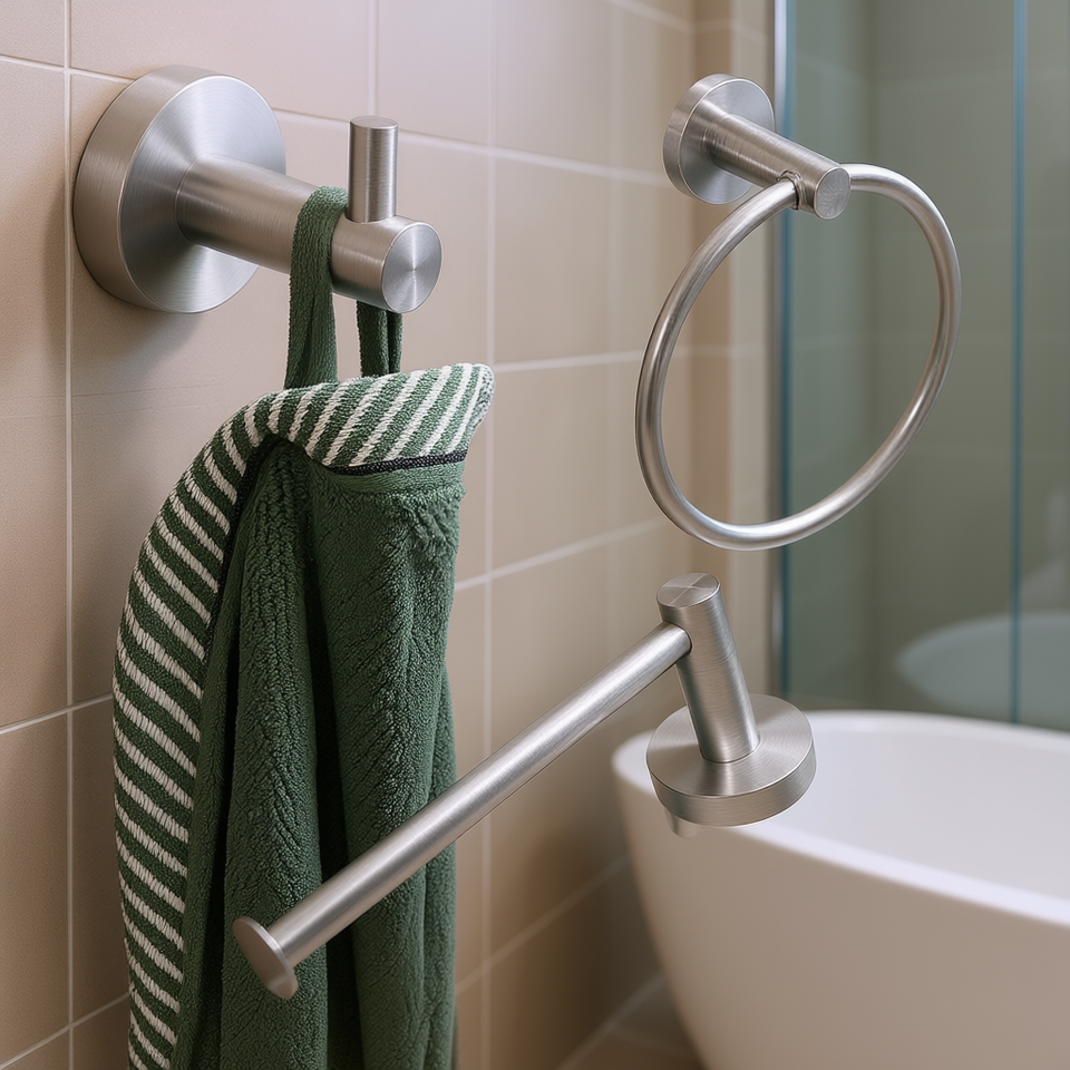 Ensemble d'accessoires de salle de bain modernes en acier inoxydable, finition argent brossé, support mural pour serviette, crochet pour peignoir, barre de suspension, design contemporain