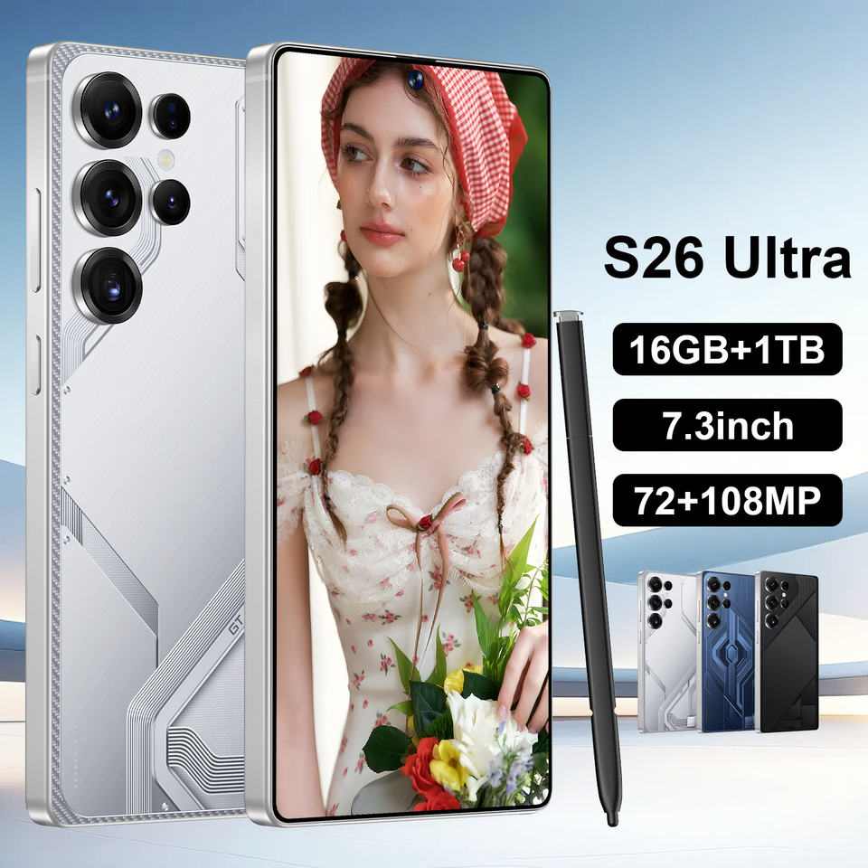 Téléphone portable débloqué S26 Ultra 5G de haute qualité, écran Full 7,3 pouces, appareil photo 108MP, système Android, déverrouillage par reconnaissance faciale et empreinte digitale, smartphone