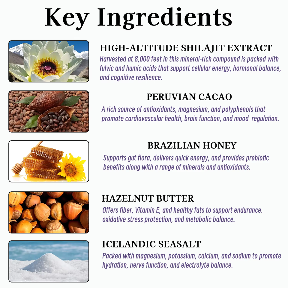 Ingrédient principal:Extrait de shilajit de haute altitude, Cacao péruvien biologique, Beurre de noisette