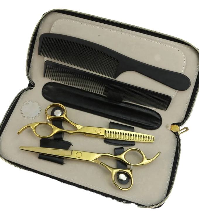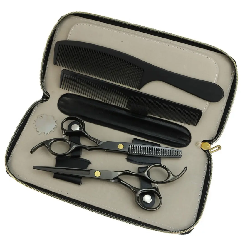 Kit de ciseaux à effiler ARISTON INTERNATIONAL de haute qualité couleur argent, 6 pièces, en acier inoxydable, avec étui en cuir à fermeture éclair
