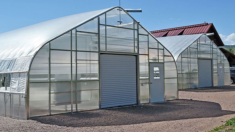 Serre tunnel 30 'X 150' D0100X3ARHX pour film plastique EVA transparent de 6 mil, cadre froid, manivelle, côtés enroulés
