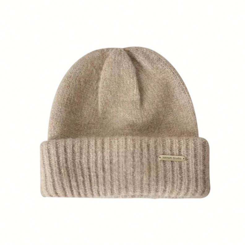Bonnet en cachemire tricoté, bonnet personnalisé en mélange de laine avec logo en métal