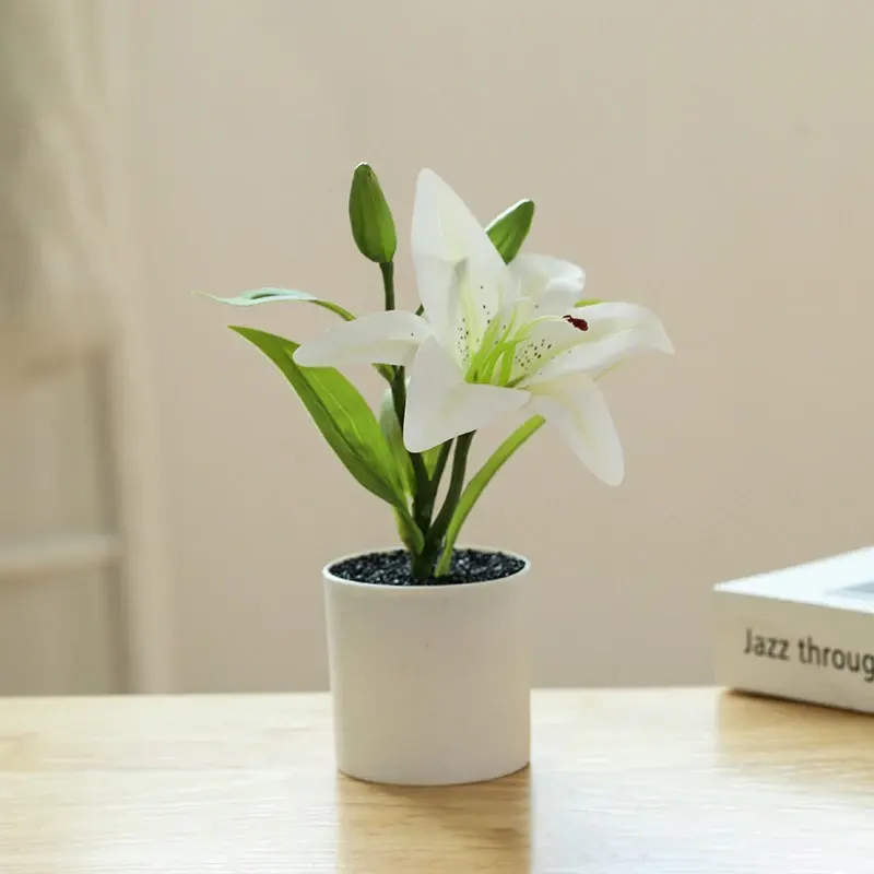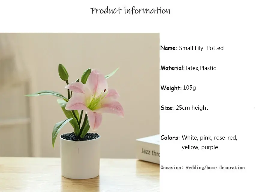 Pot de fleurs en plastique blanc de haute qualité, petit format, avec lys Cala artificiel en soie, plante artificielle orientale, fausse fleur pour la remise des diplômes