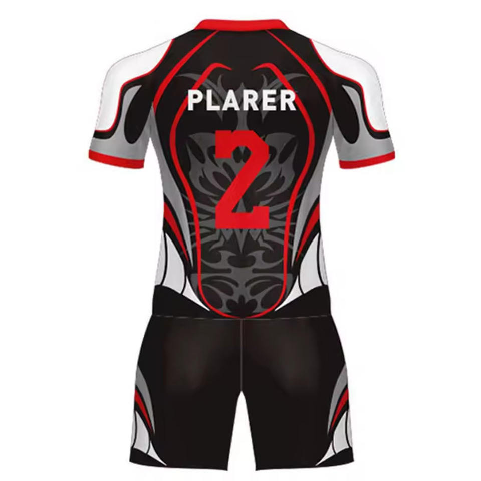 Vêtements de sport de haute qualité 100% polyester respirant, uniforme de rugby court, protection UV, vêtements de sport personnalisés par transfert thermique pour club