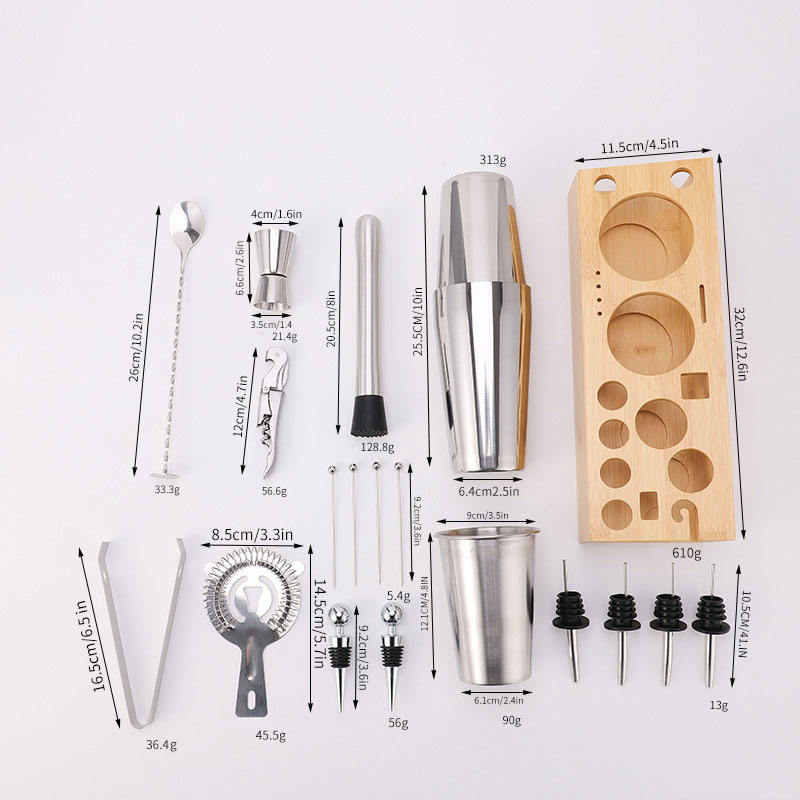 Ensemble d'outils de bar en acier inoxydable de haute qualité 19 pcs Boston Shaker Set Barman Kits avec support en bambou