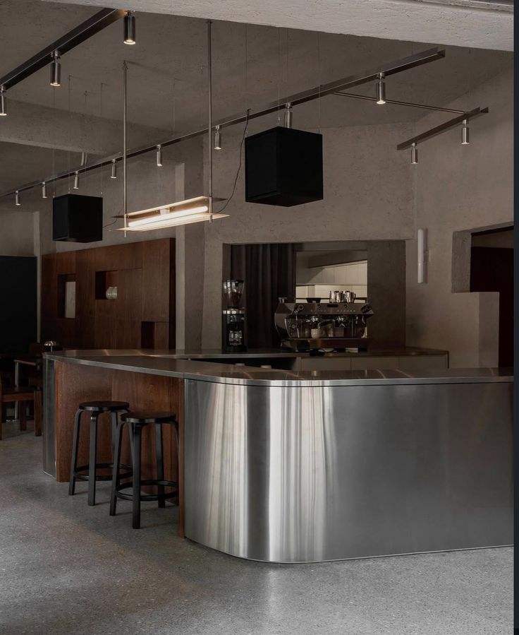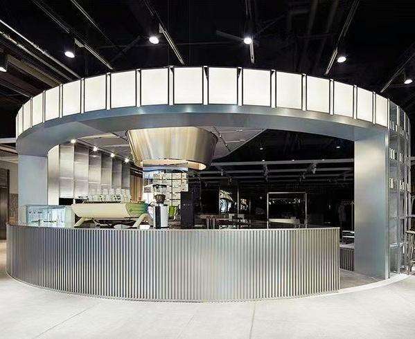 Comptoir de réception en acier inoxydable de haute qualité, forme personnalisée, éclairage LED supérieur, panneau publicitaire pour café Mal