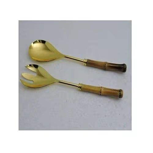 Ensemble de fourchette de cuillère de serveur de salade d'acier inoxydable de haute qualité avec des accessoires de cuisine de placage à l'or pour des salades manche en bois
