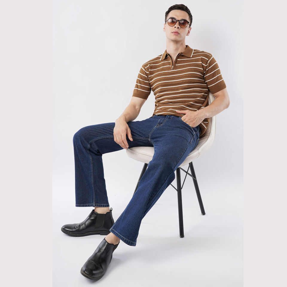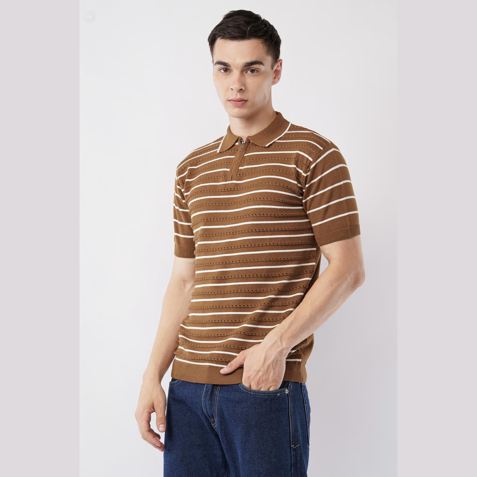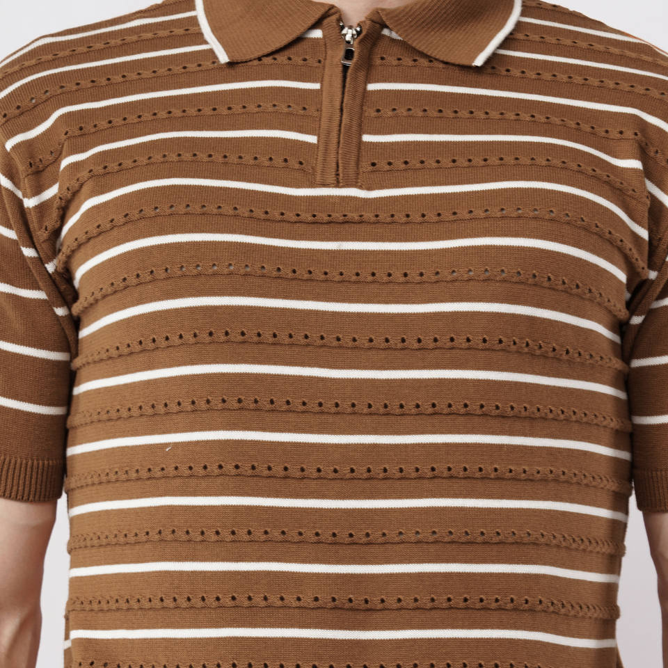 High Quality Summer Combed Cotton Knitted T-Shirt for Men Half-Sleeved with Luxury Design and Striped Pattern Zipper Included