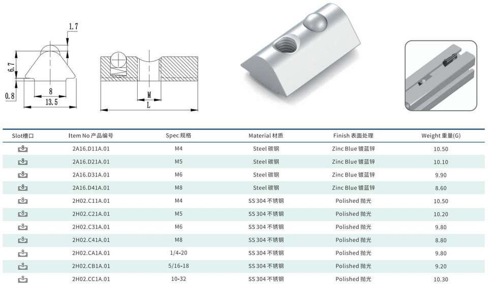 Fente demi-ronde de fournisseur de haute qualité 8 M5 M6 M8 attaches spéciales d'écrous en T coulissants