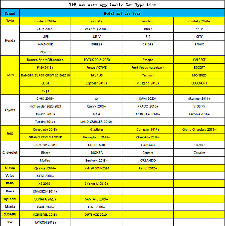 FORD (CHANGAN), Toyota (FAW), VW (FAW), Gué, MAZDA (CHANGAN), Chevrolet, TESLA M., FORD (JMC), Tesla, Subaru, HYUNDAI, BMW, Volvo, Honda (GAC), Jeep, Nissan, HONDA, JEEP (GAC FCA), Buick, Toyota, HONDA (DONGFENG)Adaptation du véhicule