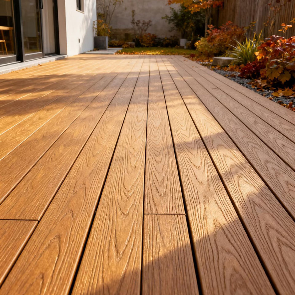 Terrasse en composite bois-plastique (WPC) de haute qualité, aspect teck 3D, pour piscine, jardin et terrasse.