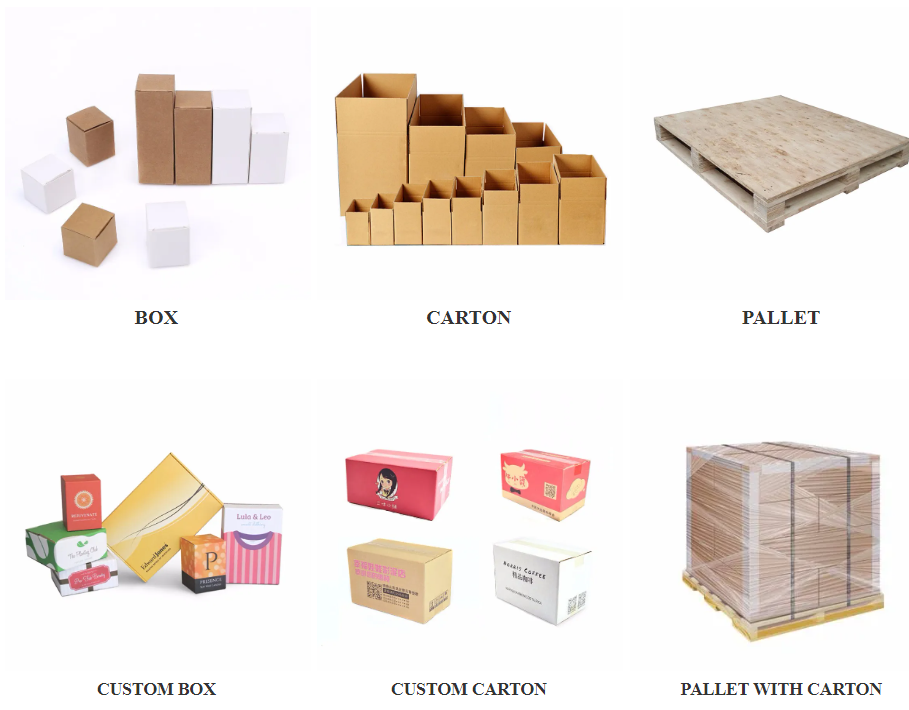 Palettes, boîtes en carton, boîtes en bois ou comme exigences des clients