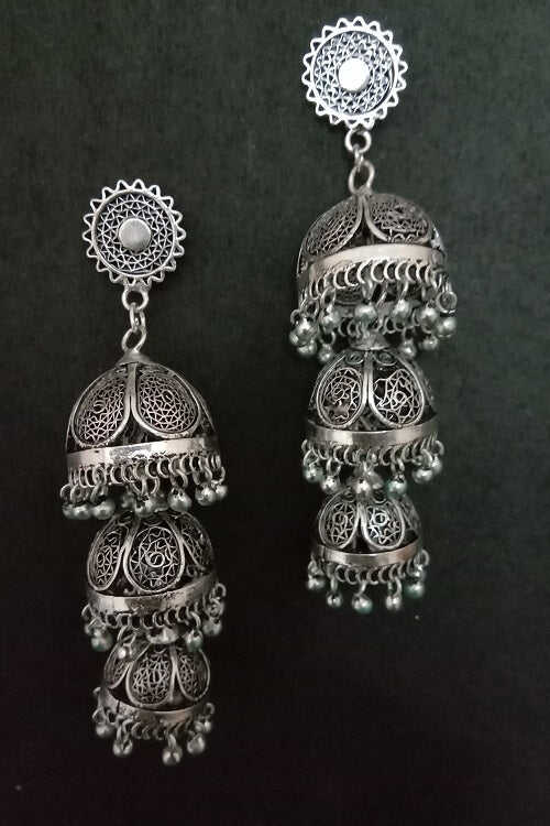 Type:Silver Linings Trio Oxidised Silver Filigree Handmade Jhumka Earrings
