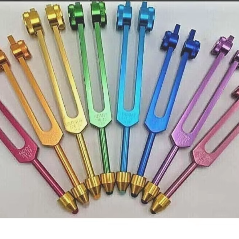 High Quality Tuning Fork Chakra Weighted Set of 8 for Healing with Gem Amplitudes Color Coded..