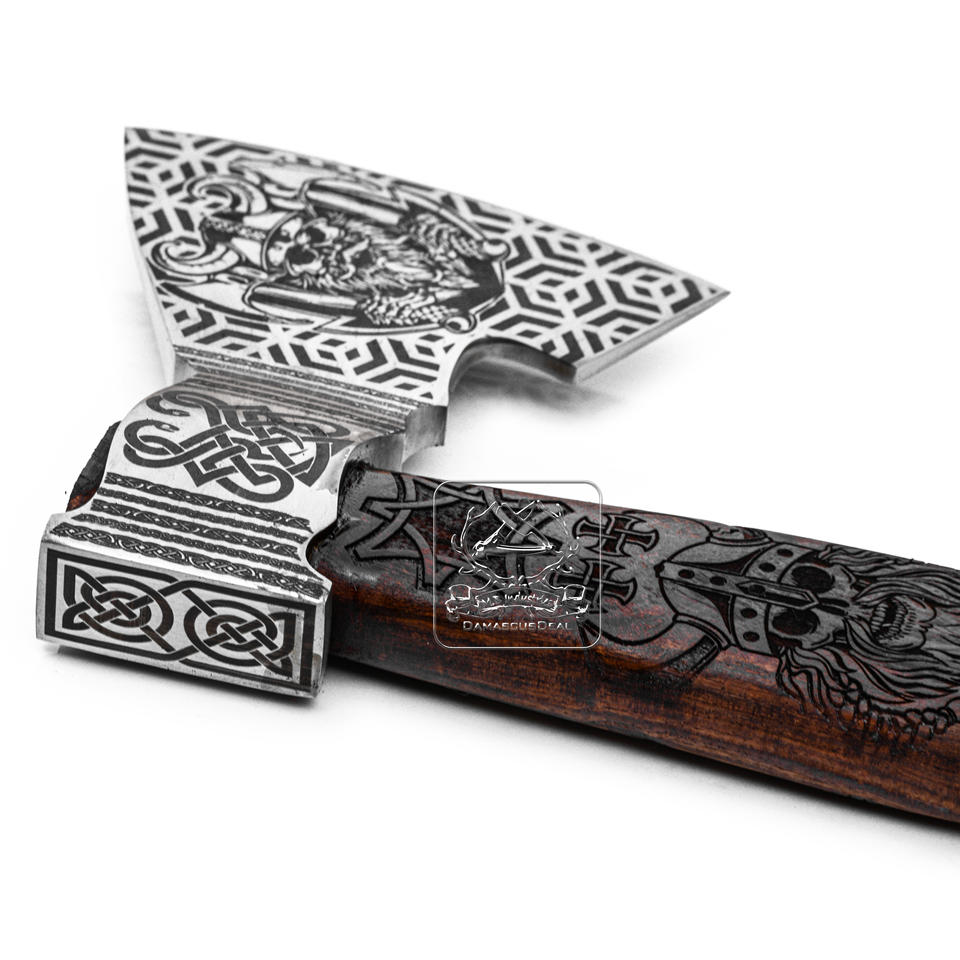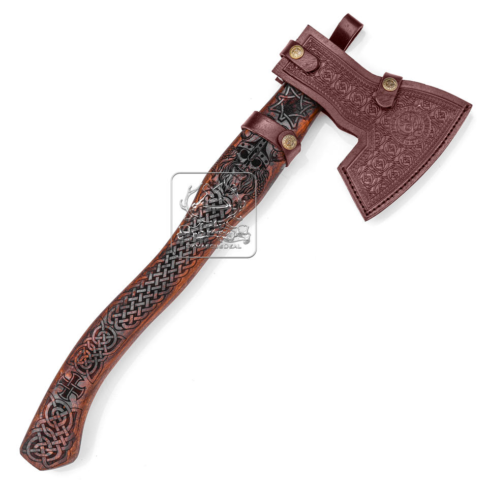 Lame gravée au laser en acier damas de hache DD-VA-ENG-103 de haute qualité avec gaine en cuir gaufré et hache de camping à manche en bois
