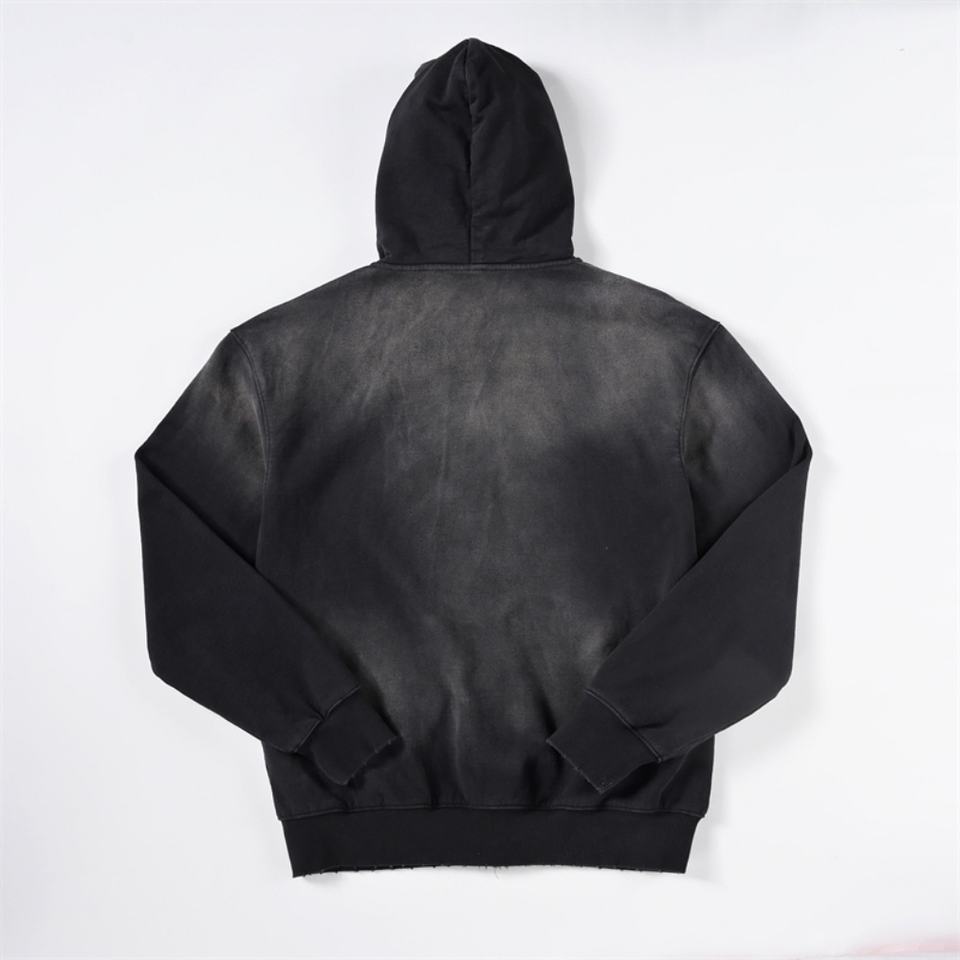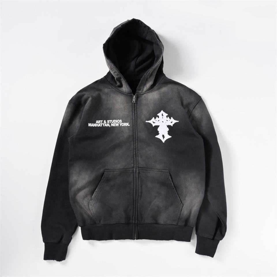 Sweat à capuche court vintage de haute qualité pour homme, noir, en tissu éponge, effet délavé, broderie, lavage à l'acide, effet délavé au soleil, fermeture éclair