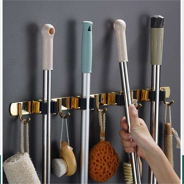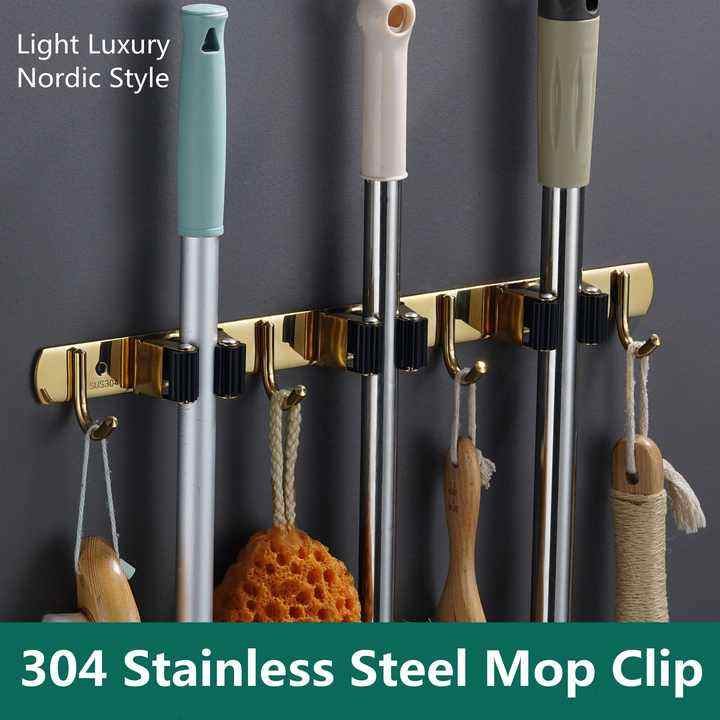 Support mural en acier inoxydable de haute qualité pour balai et serpillière avec 3 clips et 4 crochets, rangement d'outils, organisateur pour salle de bain