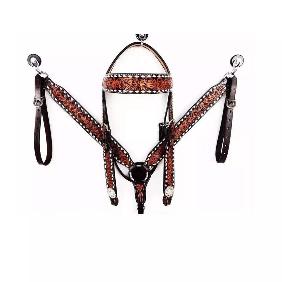 High Quality Western Leather Horse Tack Set Hand Tooled Headstall & Breast Collar White Buck Stitched Durable