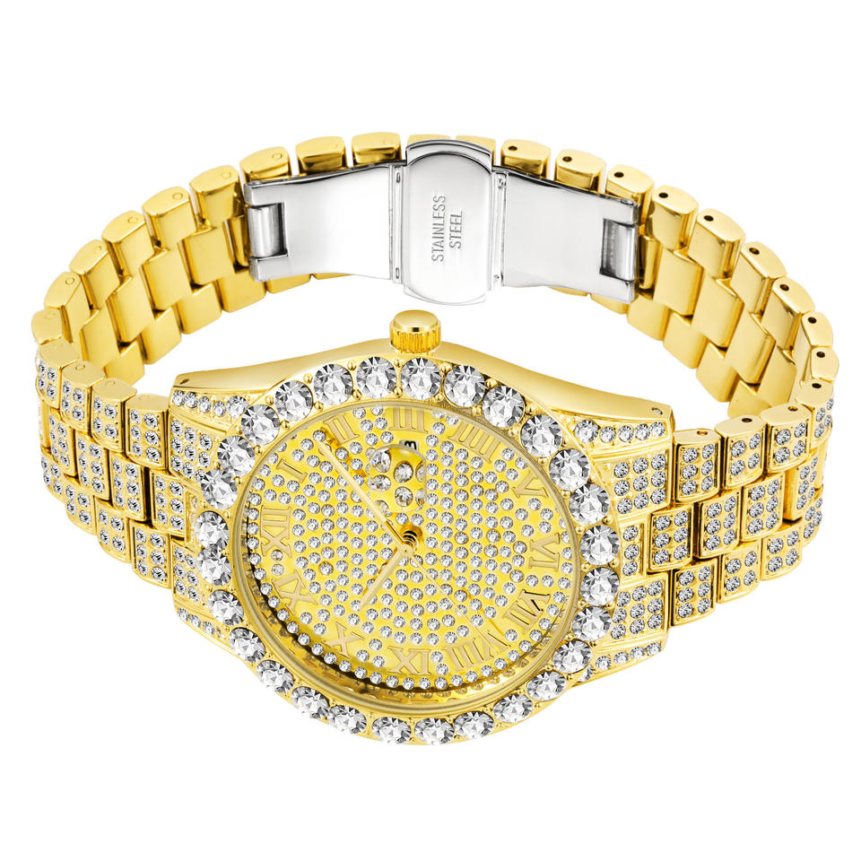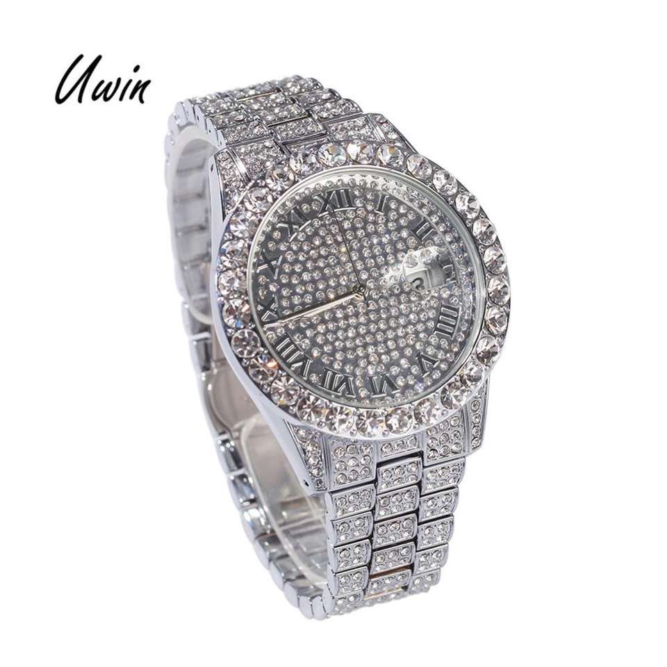 UWIN Montre unisexe hip‑hop étanche cadran large pavée de zircones, acier inoxydable et alliage de zinc, argent/or/rose