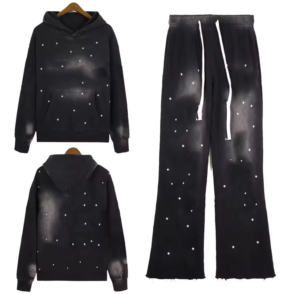 Survêtement à capuche décontracté personnalisé de haute qualité avec strass, coupe régulière, effet vieilli, pour hommes, vente en gros