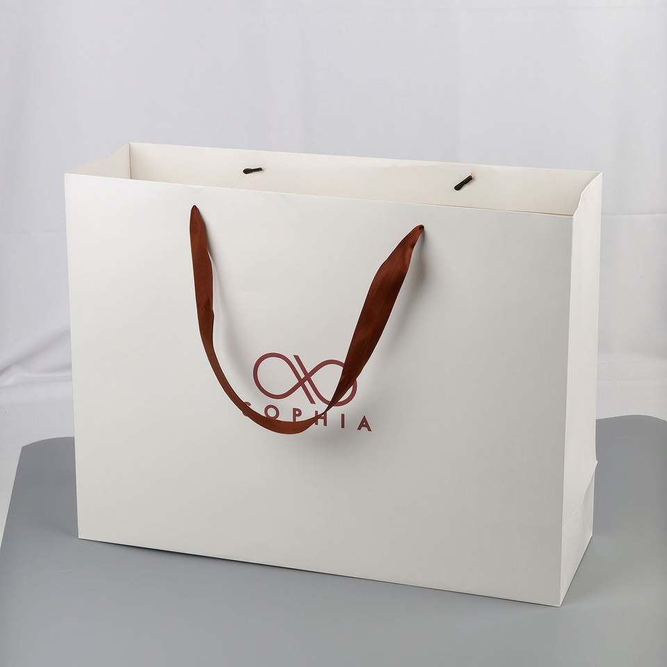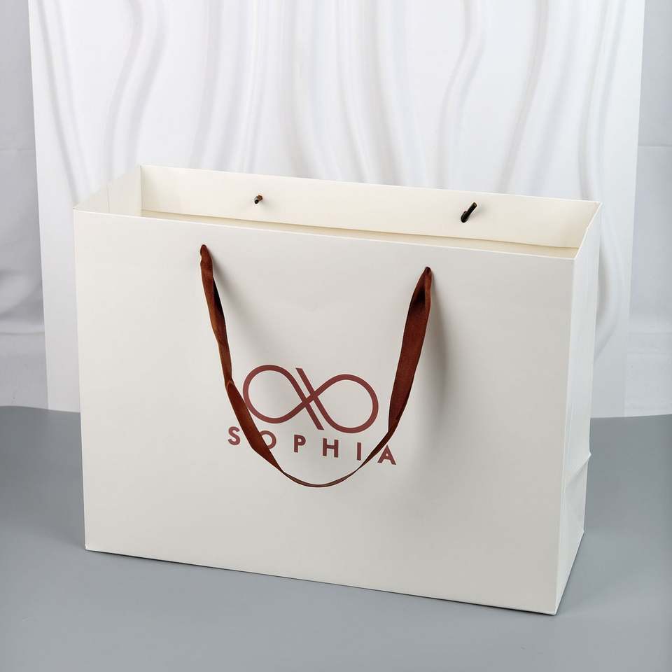 Sacs de luxe en carton recyclé personnalisables de haute qualité, impression UV, poignées en ruban doré, pour supermarchés et cosmétiques