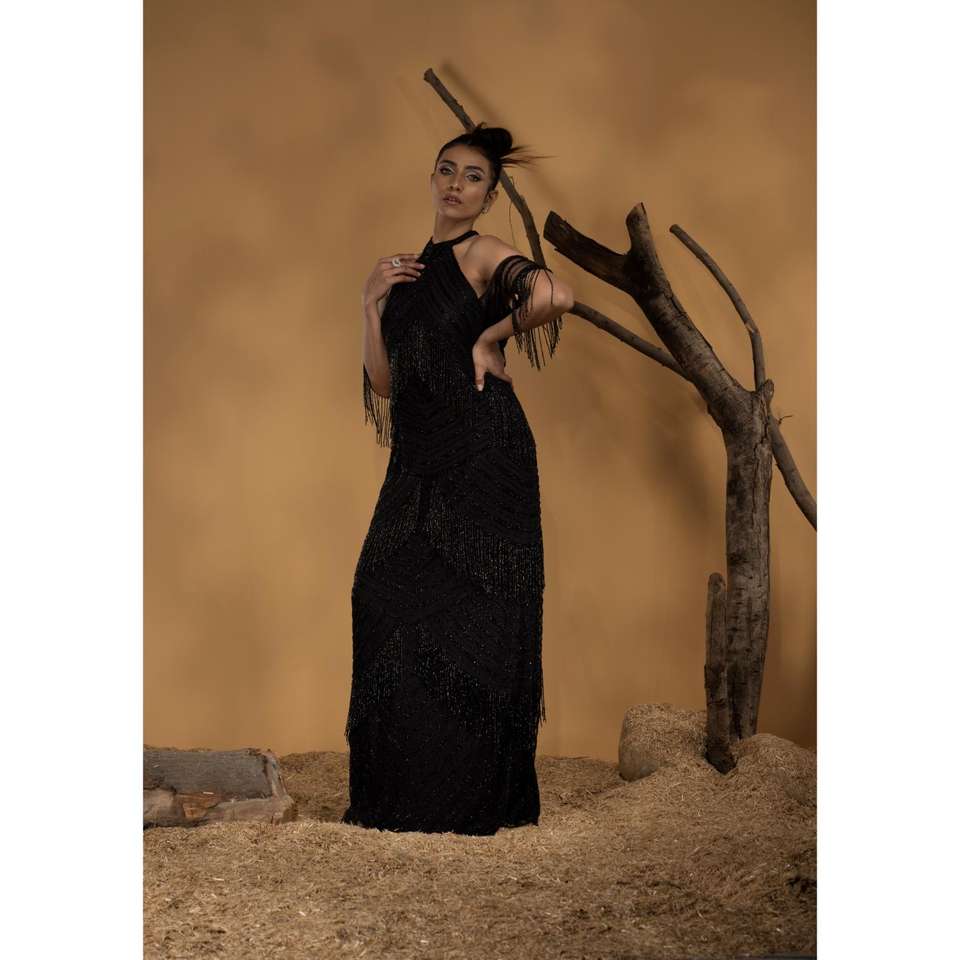 High-Quality Women Halter Neck Gown with Fully Embroidered & Black Beads for Wedding Party and Red Carpet Events for Bulk Export
