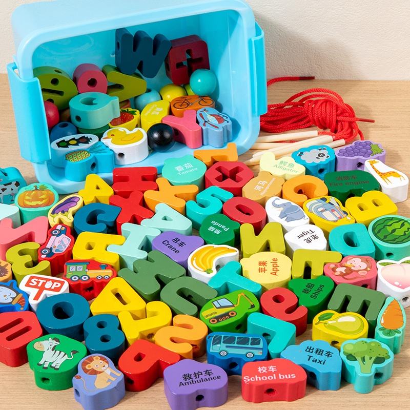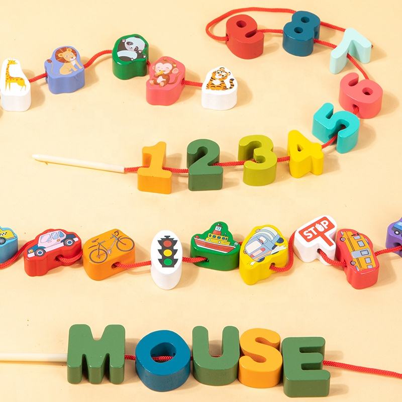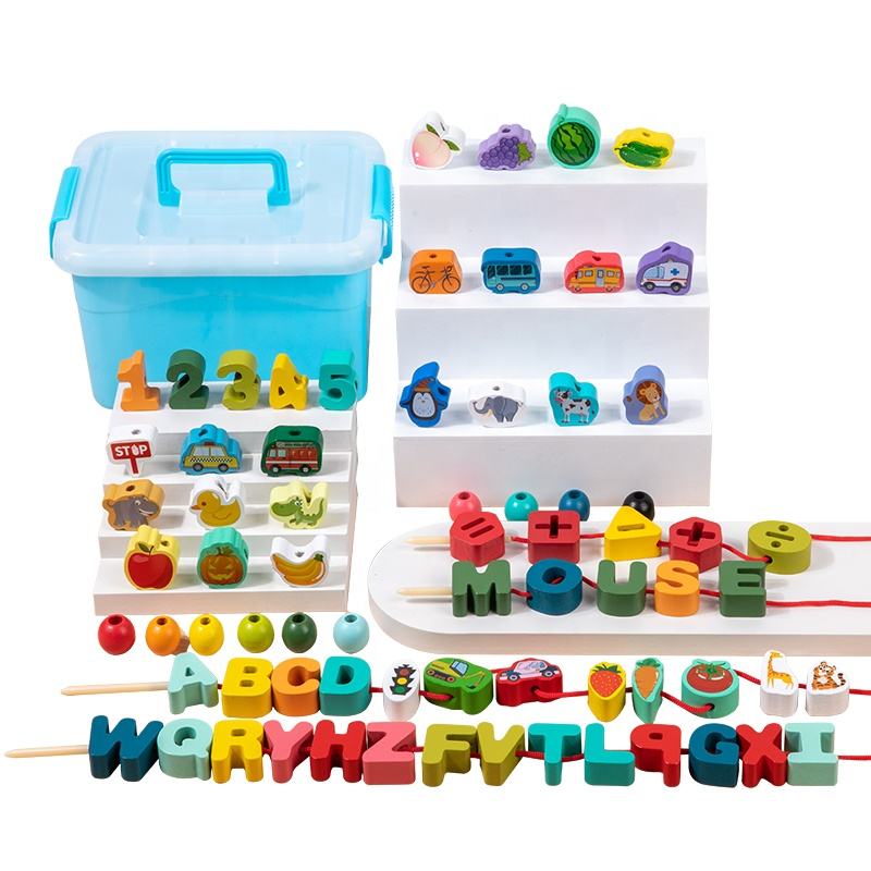 Blocs de construction en bois de haute qualité, dessin animé, éducatifs, jeu de ficelle pour enfants, perles à enfiler