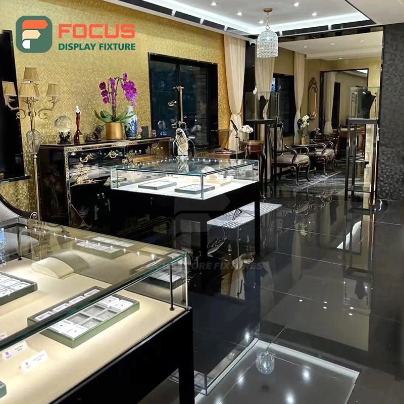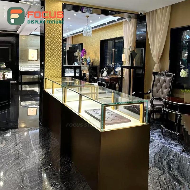 Comptoir à bijoux en bois de haute qualité, vitrine moderne en verre avec accents métalliques pour magasin de détail