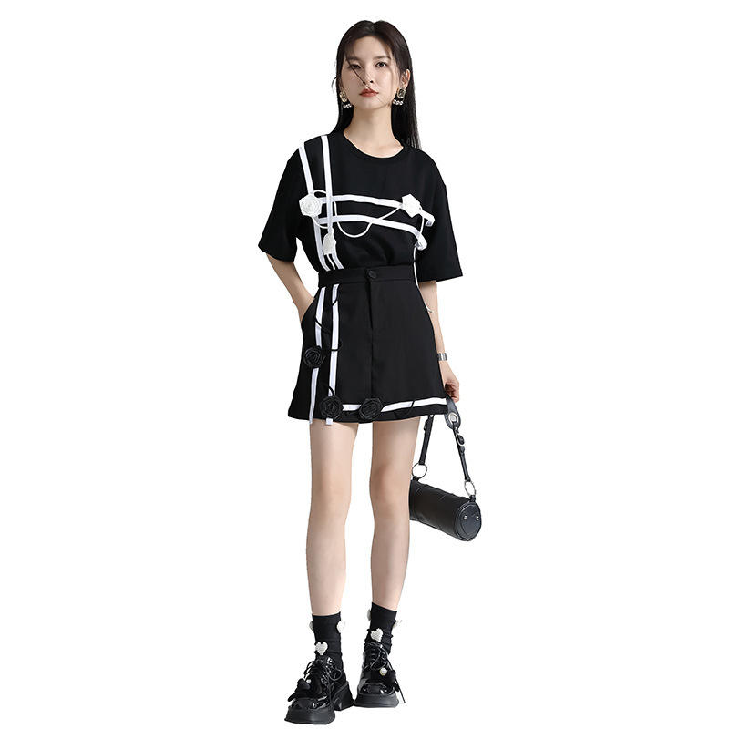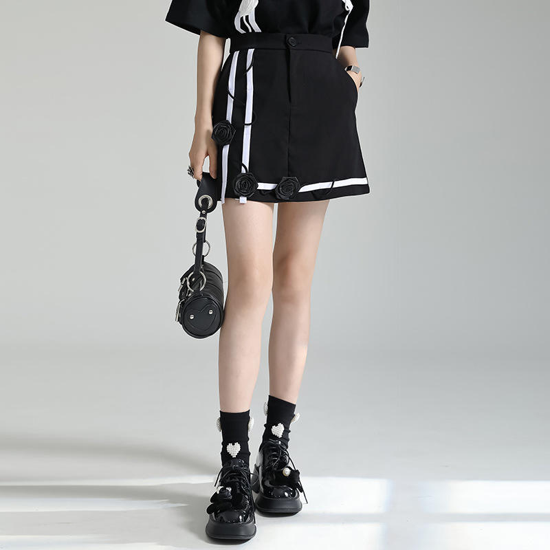 Jupe courte de haute qualité, design de niche, noir et blanc contrastés, avec décoration florale 3D et taille élastique