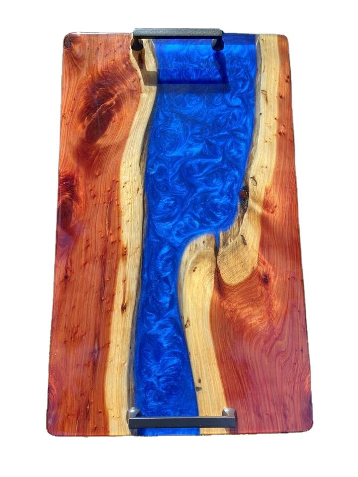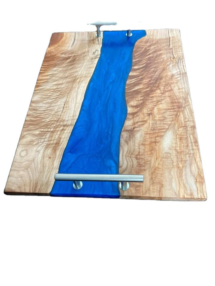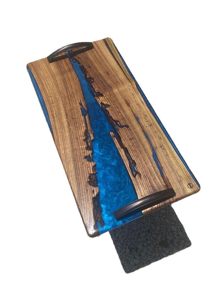 Plateau de service décoratif en résine de restaurant très vendu avec bois d'acacia disponible au prix de gros avec poignée en métal