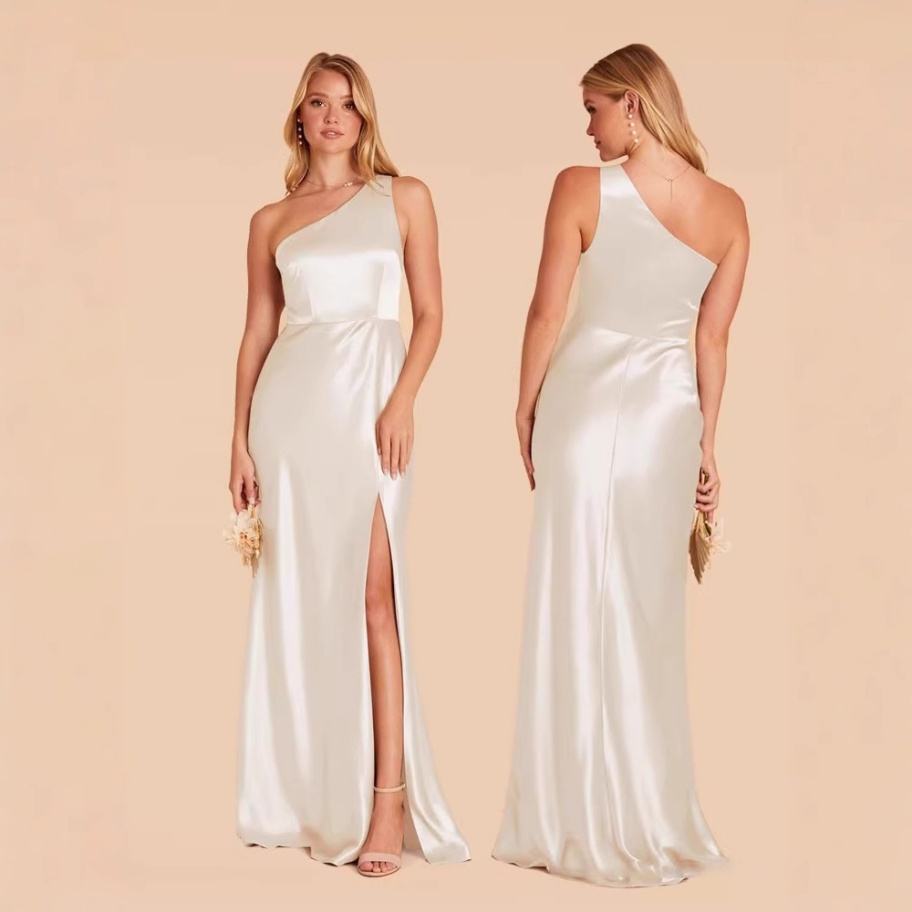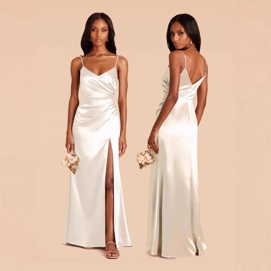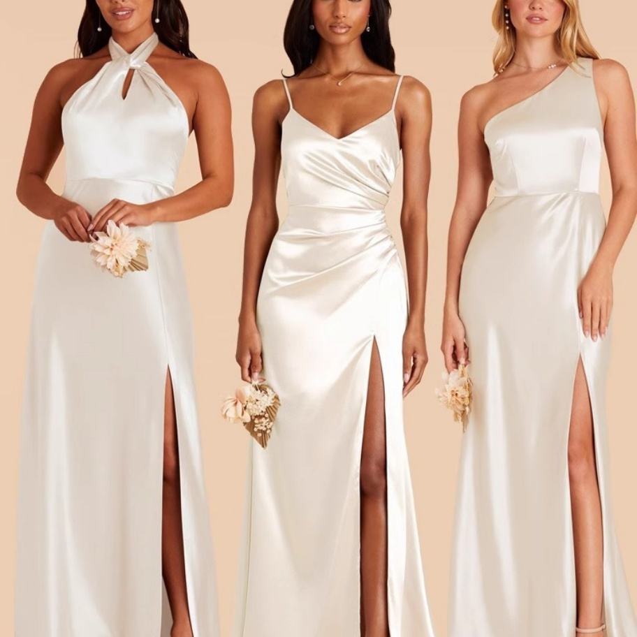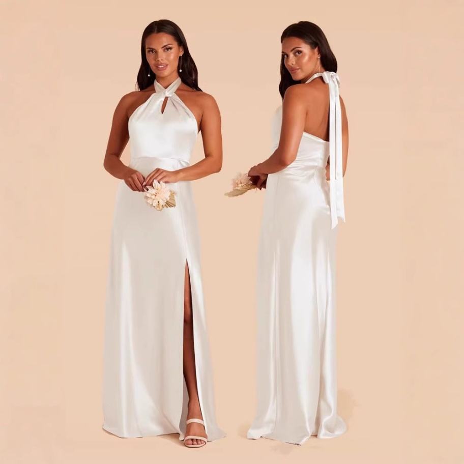 Robe de bal et de demoiselle d'honneur en satin, fendue haute, grande taille, avec dentelle, dos nu et bretelles, élégante