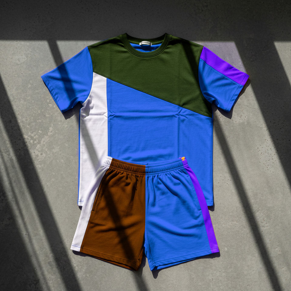 Ensemble d'été 2 pièces pour homme grande taille en coton respirant à manches courtes et short, avec contraste de couleurs et deux empiècements, style urbain