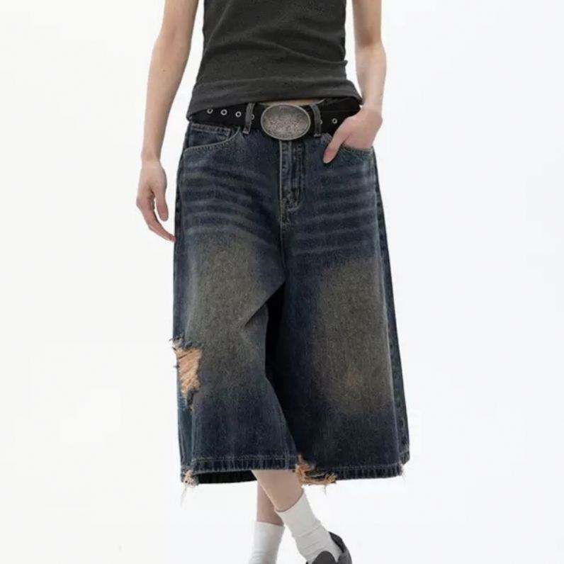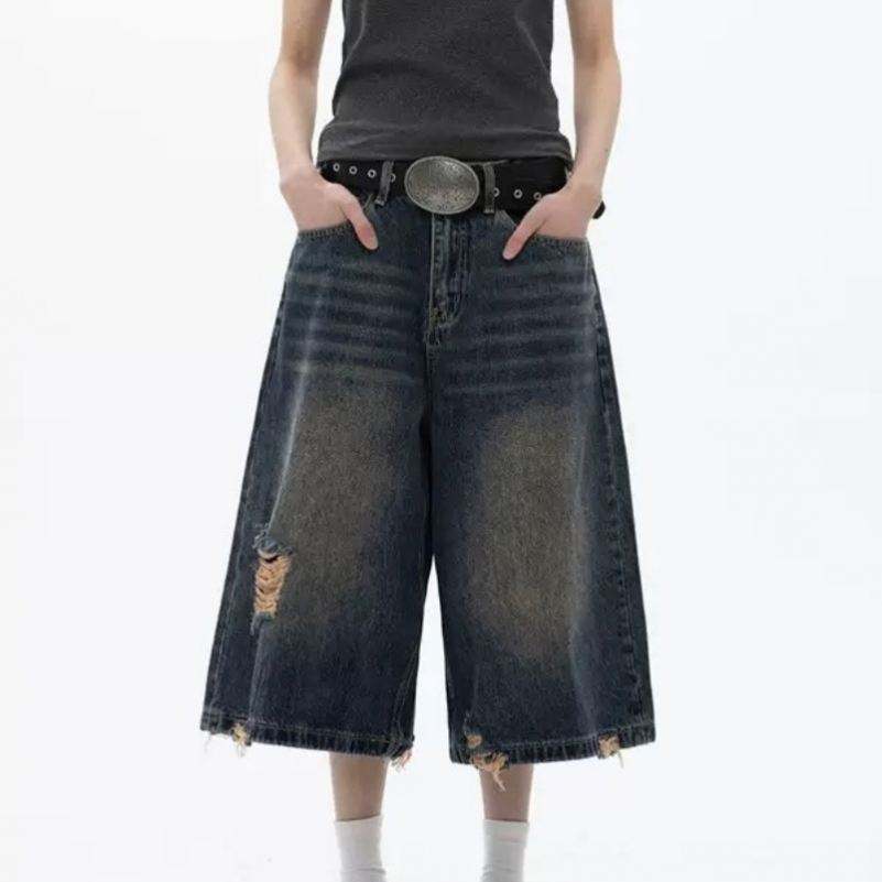 Pantalon en jean déchiré coupe sept-huizièmes style High Street, nouvelle collection été, tendance, décontracté, coupe ample, jambe large, coupe épurée, couleur inaltérable, taille mi-haute