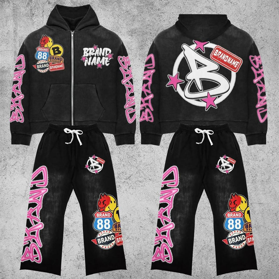 Ensemble de sweat à capuche imprimé en silicone High Street sweat à capuche délavé à l'acide et pantalon de survêtement évasé survêtements délavés au soleil pour hommes