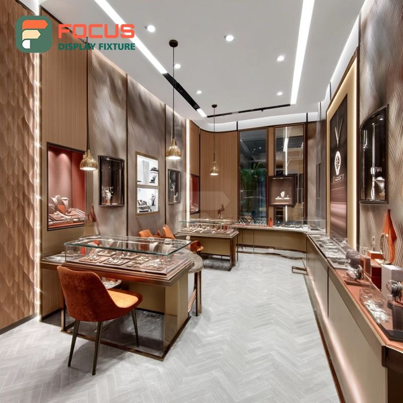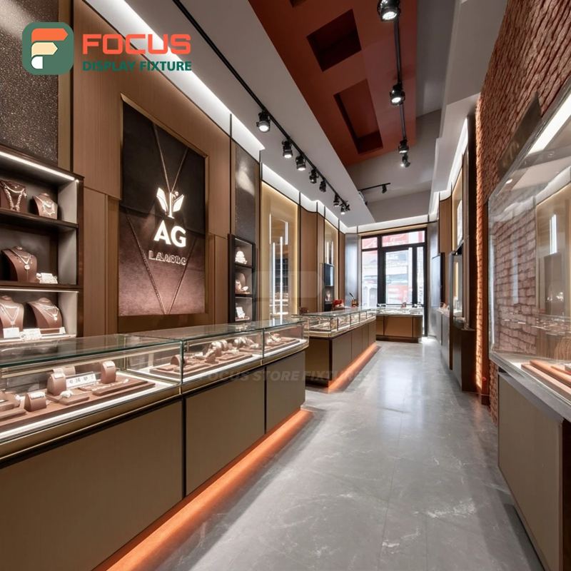 Fabricant d'agencements de vente de bijoux personnalisés haute visibilité, comptoir de centre commercial avec panneau en verre trempé, vitrine