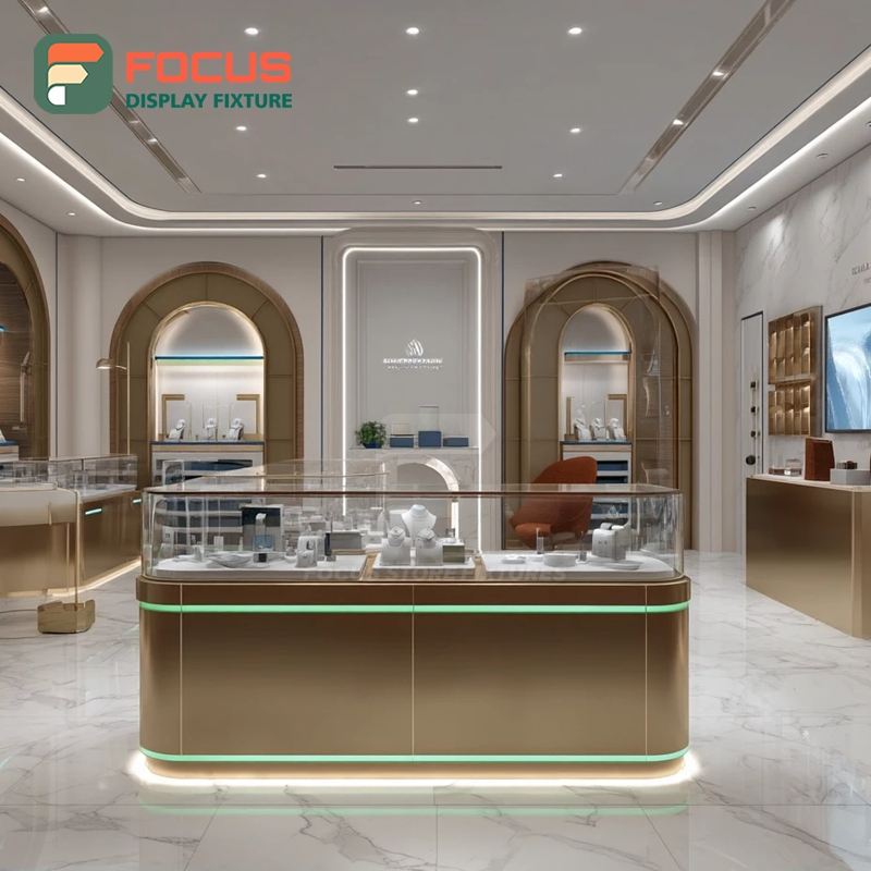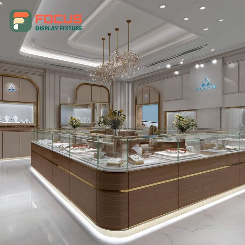 Vitrine de magasin de bijoux à haute visibilité, cadre en bois, vitrine en verre pour bijouterie