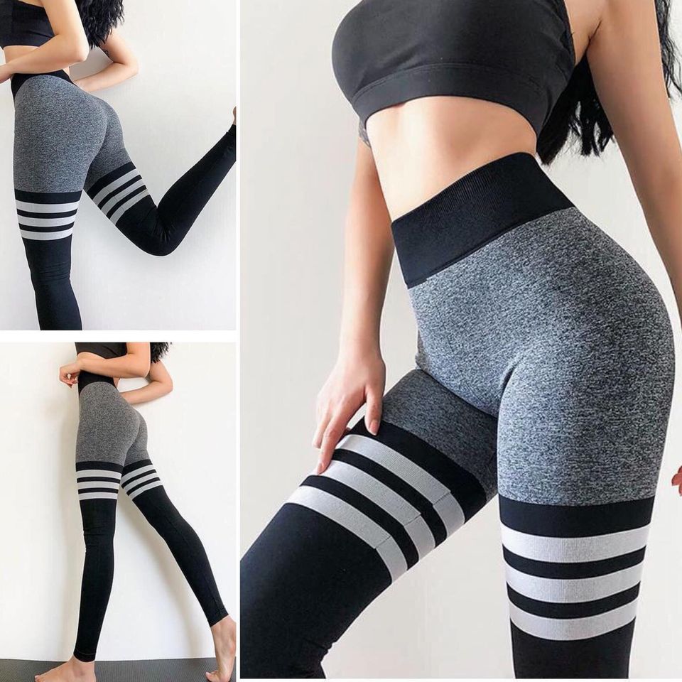 High-Waist Striped Women's Yoga Leggings Right Leg Logo Elastic Waist Closure 220g Spandex/Nylon Ankle-Length Sweat-Wicking