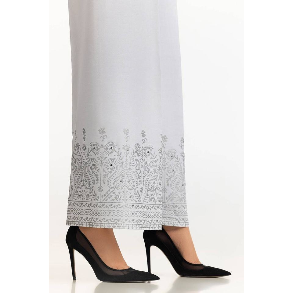 Pantalon taille haute blanc en soie brute imprimée au bloc TR-24-21 en tissu crêpe respirant avec broderie décorative 100% soie