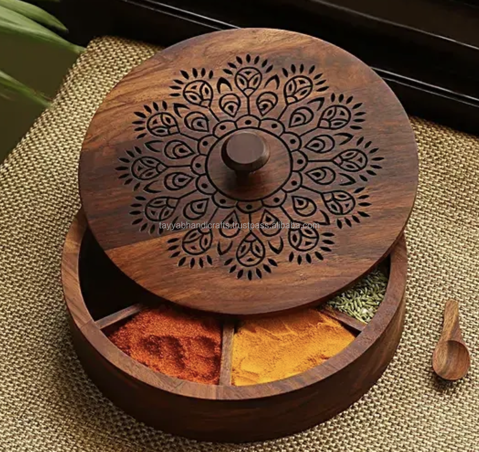 Pot à épices en bois à forte demande cuisine ronde 3 compartiments pot à épices en bois conteneur boîte à sel en bambou avec 1 cuillère